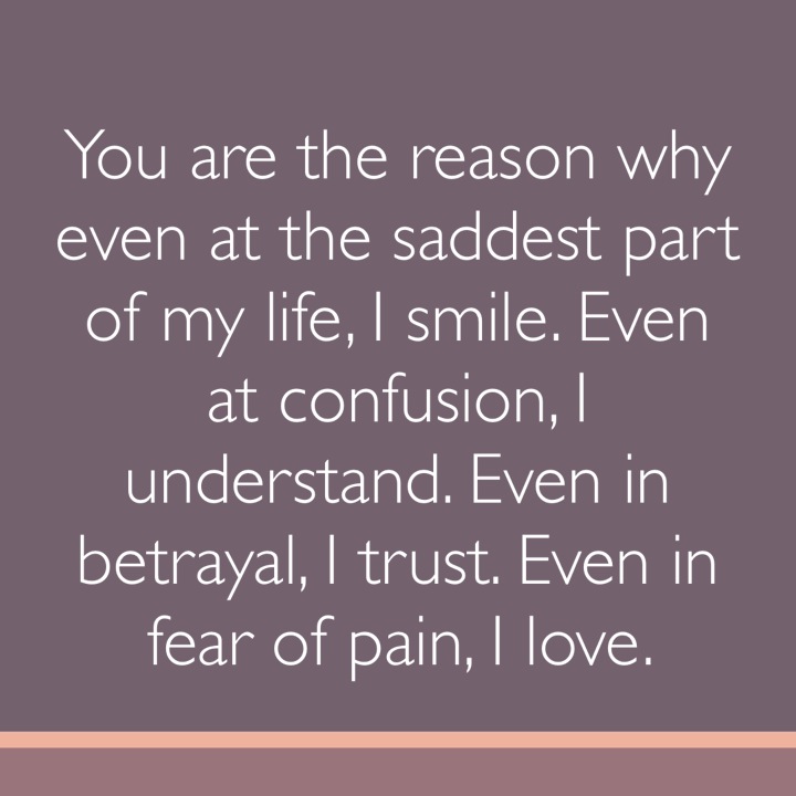 You are the reason why even at the saddest part of my life, I smile. Even at confusion, I understand. Even in betrayal, I trust. Even in fear of pain, I love.
